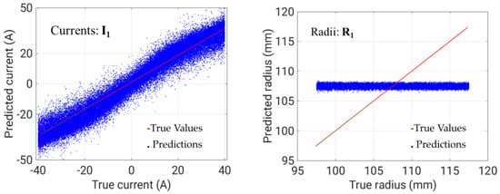 It is interesting to show the scatter plot of the true vs. predicted radius for coil 1 for all the test cases (Figure 9). Basically, the SNN keeps the estimate of the radius equal to the average value, regardless of the actual value. This is due to the mutual roles of the current and radius in this problem. The expression of the flux density on the axis due to a filamentary coil can be considered as follows: