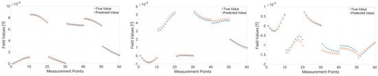The flux density in the “measurement” points corresponding to the different approaches are reported in Figure 6. The scatter plots shown in Figure 7 show that the problem of predicting the currents can be solved by the neural networks accurately, and the dispersion increases with the distance of the coils from the ROI.