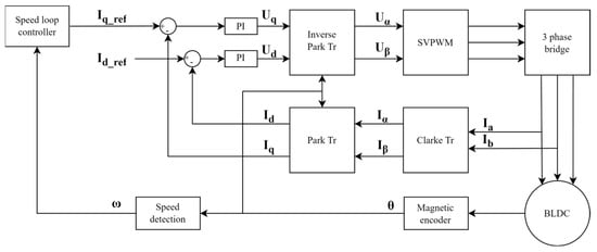 The FOC driver of BLDC is mainly composed of Clarke transformation, Park and inverse Park transformation, SVPWM, and a current loop controller. The block diagram of the control structure is shown in Figure 1: