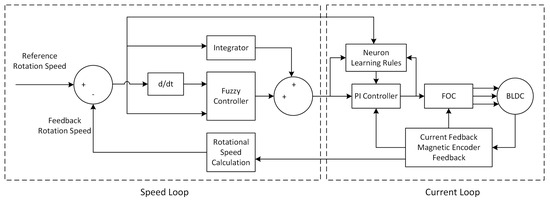 The traditional FOC controller uses two PI controllers to complete the speed and current closed-loop, respectively, and because the parameters have to be adjusted several times to achieve better control, the tuning process is cumbersome [26]. It is difficult to achieve good control results by using constant PI parameter in the case of load changes. In order to improve the control performance of the servo driver, the parameter tuning process of the PI controller is simplified, and the adaptability to load changes is enhanced. Based on the original double PI controller, a fuzzy integral-neuron proportional-integral double-loop controller (FI-NPI) is proposed. The BLDC current loop adds a neuron structure to the original PI controller to realize the online adjustment of PI parameters. The fuzzy integral controller is used to complete the closed-loop control of the BLDC speed regulation, which makes the controller independent of the system model and has strong robustness and stability. Compared with the PI velocity closed-loop method, its response time is shorter.