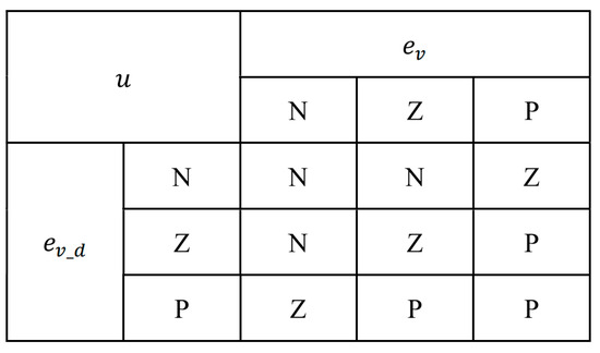 The speed-loop–fuzzy-controller is mainly composed of input fuzzification, fuzzy reasoning, and output defuzzification [30]. The input fuzzification of this system adopts the commonly used classification fuzzy set method, and the output defuzzification adopts the centre of gravity method to make output smoothly. Let the BLDC rotational speed error be , and the difference of rotational speed error be . The domain classification of the fuzzy controller will affect the output accuracy of the controller, and theoretically, the more domain divisions, the higher the output accuracy, but it will increase the complexity of the program. The BLDC controller is based on an embedded platform with limited computing power. Therefore, in the case of satisfying the accuracy requirements, the fewer domain divisions, the better. For the balance of precision and computing power, we divide the domain of input and output into three levels: positive (P), zero (Z), and negative (N). Then, build fuzzy control rules, as shown in Figure 3:
