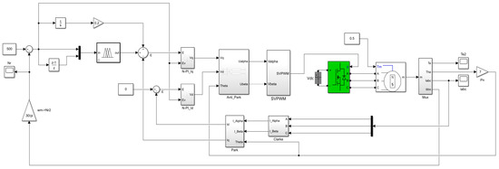 In order to verify that the FI-NPI dual-loop controller can effectively complete the brushless DC speed regulation closed-loop control task and compare the control effect with the traditional dual-PI speed closed-loop controller, this paper uses the Simulink toolbox to carry out simulation experiments on MATLAB Version 9.2 (R2018b) to build corresponding simulation modules for each component of the driver. Figure 4 shows the overall simulation structure block diagram.