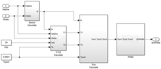 The structural block diagram in Figure 4 is mainly composed of the FI speed loop controller, NPI current loop controller, FOC control component, three-phase full-bridge power module, and BLDC. Among them, the FOC control component is composed of the Clarke transformation, Park transformation, reverse Park transformation, and SVPWM. The reference target rotational speed of the experimental setup is 500 rpm. The structure of the SVPWM space voltage vector synthesis algorithm is relatively complicated, which consists of four parts: sector calculation, vector action time calculation, PWM time calculation, and PWM waveform generator. In order to make the simulation as similar as possible to the physical performance, the settings of the simulation parameters are consistent with the physical system. We set the simulated DC bus voltage to 24 V. The PWM modulation frequency used to drive the three-phase full bridge is set to 10 kHz. The specific implementation of the SVPWM simulation component is shown in Figure 5: