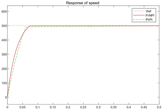 The model and algorithm are simulated in the Simulink simulation environment. In order to test the control effect of the FI-NPI double-loop controller, a double PI controller was added as a control group. The target speed is set to 500 rpm, and the image of the speed closed loop using the double PI controller and the FI-NPI double loop controller is shown in Figure 10: