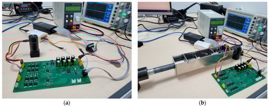 In order to test the performance of the FI-NPI double-loop controller on an actual servo drive, the neuron PI control algorithm and fuzzy integral control algorithm of MATLAB simulation are implemented in the C language to replace the original current loop and speed loop PI controller in the lower computer software. The BLDC operating load is not considered in the simulation. However, in practical use, the friction of the manipulator will affect the dynamic performance of the BLDC motor to a certain extent. Specifically, the rotation of the BLDC will drive the expansion and contraction of the robotic arm, which will cause a significant change in the friction of the connecting rod of the robotic arm. In order to verify the robustness of the FI-NPI algorithm, the physical experiment carried out the speed closed-loop test on the two conditions of BLDC no-load and load with manipulator. This is shown in Figure 11: