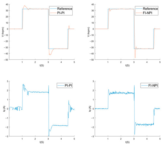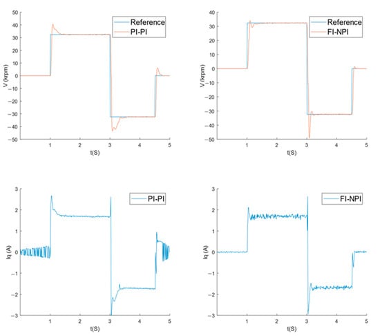 Use the host computer software to record the BLDC rotation speed and the current of q-axis every 10 mS. Figure 13 shows the control effect of the dual PI controller and FI-NPI controller on the BLDC motor without load: