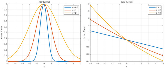 The performance of these two kernel functions is illustrated in Figure 3. The RBF kernel reaches its maximum value when the test point’s distance is zero, gradually approaching zero as the distance increases. This indicates a limited learning ability beyond a specific range. Conversely, the poly kernel exhibits increasing kernel values across all ranges as the poly degree rises, but its interpolation ability weakens. To harness both nonlinear learning capabilities simultaneously, a combined approach is considered.