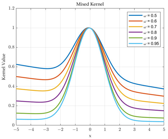 Figure 4 demonstrates the kernel values resulting from the fusion of the RBF and poly kernels, with assumption of parameters for the RBF kernel and for the poly kernel. Adjusting the parameter in Equation (15) reveals that the mixed kernel function exhibits a consistent nonlinear fitting effect under varying weights. However, the choice of parameters significantly influences algorithm performance, a topic explored in the subsequent section.