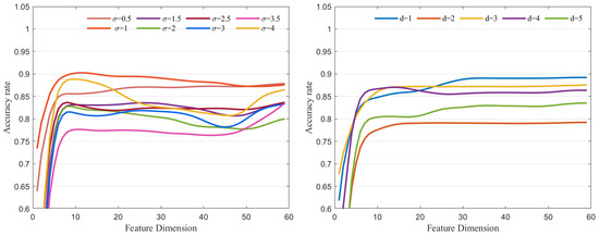 Represented by the poly kernel function, research has demonstrated its commendable extrapolation capability. Larger values of parameter contribute to superior interpolation capability but diminish extrapolation capability. Conversely, smaller values of enhance extrapolation capability but weaken interpolation capability. The parameter range for the poly kernel is set to {1, 2, 3, 4, 5}, as illustrated in the right of Figure 5, showcasing the recognition accuracy comparison for varying values of parameter d. At , as feature dimensions range between (10, 30), recognition accuracy exhibits slower growth compared to other parameter values. At , recognition accuracy remains stable when the feature dimension reaches 12.