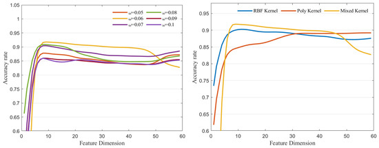 To explore the influence of the weight on the algorithm’s recognition effectiveness, comparative experiments with different parameter values are conducted. The left of Figure 6 presents the recognition rate comparison for the mixed kernel parameter , considering values in the set range. As feature dimensions increase up to 10, the proposed algorithm exhibits a rapid increase in recognition accuracy under all parameters. Subsequently, recognition accuracy gradually declines as dimensions continue to grow, indicating information redundancy and a subsequent decrease in individual recognition accuracy. This validates the algorithm’s ability to extract effective feature information with a low feature dimension. When is set to 0.06, recognition accuracy is highest within the parameter set, with recognition accuracy under other parameters distributed between (85, 90).