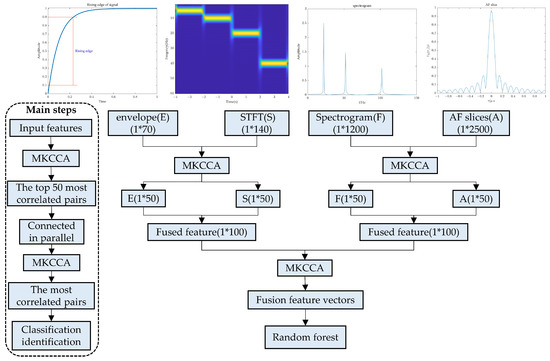 Canonical correlation analysis (CCA) serves as a linear multivariate statistical method for examining the correlation between two sets of features, identifying canonical eigenvectors with higher correlation indicative of original features. CCA encounters challenges when extracting a valid representation from data that does not adhere to a linear distribution. Therefore, to adapt to the non-linear data characteristics, the kernel method based on CCA can be employed. The kernel function facilitates the projection of fingerprint features into a feature space, adept at handling non-linear data and extracting weak fingerprint information with greater ease. The choice of kernel function in kernel methods leads to distinct mapping spaces and diverse ways of describing the data. Jia [21] classified kernel functions into two main types: local kernels and global kernels. However, both types exhibit only one type of interpolation and extrapolation capabilities. Presently, the kernel function in radar SEI predominantly relies on a single kernel. To overcome the limitations of a single kernel, researchers explore the linear combination of kernel functions, such as multiple kernel learning (MKL) [22] and mixed kernel [23,24] approaches. In the realm of multi-kernel mapping, the high-dimensional space amalgamates multiple feature spaces. Each basic kernel optimally leverages its ability to map various features within the combinatorial space. Authors in a study [22] employed MKL to select the most appropriate base kernel at each data point, determining the optimal kernel through linear weighting of the base kernels. However, the experimental choice of the base kernel and the combination method lacks theoretical grounding and remains uncertain. In another study [23,24], addressing the absence of a single kernel with only one interpolation or extrapolation ability, authors proposed a mixed kernel by weighting the radial basis function (RBF) kernel with interpolation ability and the polynomial (poly) kernel with extrapolation ability, respectively. Essentially, mixed kernel models fall into the category of single kernel models but adopt the form of MKL. This differentiation arises from the assignment of independent weights to each kernel function in the mixed kernel, circumventing the need for solving complex optimization problems present in MKL. Mixed kernels exhibit both a robust theoretical foundation and a more convenient combination method while circumventing the necessity to learn a large number of base kernel weights.