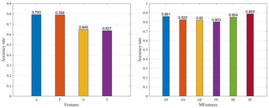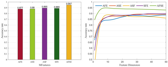 The average recognition accuracy of a single feature across all dimensions of the feature set is presented in the left of Figure 8. The recognition rate ranges from 63 to 80, indicating insufficient effectiveness for recognizing individual radar radiation sources. Recognizing the complementarity between features from different domains, the fusion of various features is explored in the subsequent analyses.
