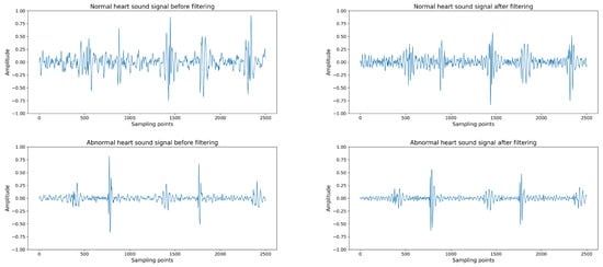 (Upper left): Normal heart sound signal before filtering. (Upper right): Normal heart sound signal after filtering. (Lower left): Abnormal heart sound signal before filtering. (Lower right): Abnormal heart sound signal after filtering. The amplitude values are relative, as the signals have been normalized.