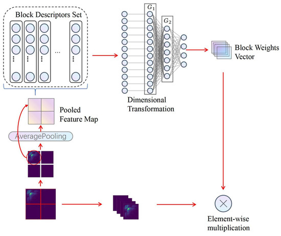 Dimensional Transformation: To process these feature vectors and extract pivotal information for the classification task, two fully connected layers, represented as linear transformation layers, and , are employed. reduces the dimensions of the feature vectors in , aiming to simplify computations and highlight key features. The dimensions of are defined as , where r is the reduction ratio. Subsequently, maps the output of to the final number of blocks B, with dimensions .