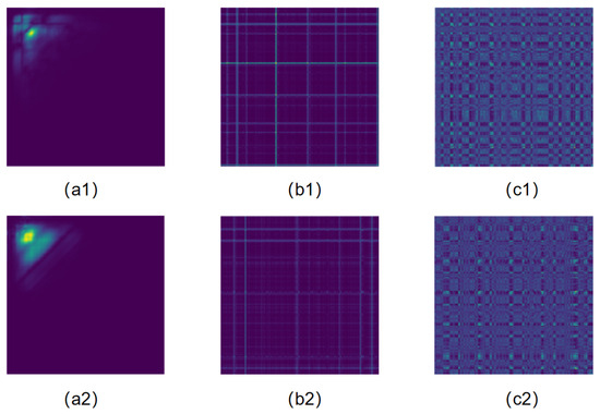 The bispectrum exhibits richer and more distinct pixel features, as shown in Figure 6a1,a2. In the bispectrum images of normal and abnormal heart sound signals, the color gradients and distributions are more pronounced, aiding in the accurate capture of heart sound signal characteristics. We also compared the bispectrum with Gramian Angular Summation Field(GASF) [51] and MTF. GASF is a variant of GAF, where the summation operation is used instead of the difference operation used in GAF, chosen for its superior preservation and highlighting of features. The GASF images are shown in Figure 6b1,b2, and the MTF images are shown in Figure 6c1,c2. From the results of classification accuracy, specificity, and sensitivity, the bispectrum also achieves the best performance.