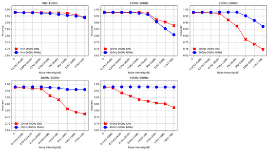 It was observed that the performance of RNNs was quite similar to the proposed method PANet. Hence, a second experiment was designed specifically to test the feature extraction capabilities and noise robustness of these two types of networks. The performance of RNNs and CNNs was compared when dealing with noise in different frequency bands.