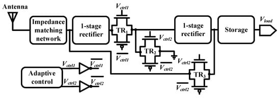 The rapid development of the Internet of Things (IoT) has led to the massive deployment of IoT low-power nodes such as smart home equipment, wearable devices, and medical implantable products. The conventional way of powering these nodes using batteries has obvious drawbacks of unsustainability, environmental pollution, and volume occupation. Therefore, finding a more suitable way of powering these nodes has become an issue that needs to be solved urgently [1,2,3,4,5,6]. Passive IoT provides a solution for this which is able to harvest energy from the environment to feed low-power sensors in a wireless sensor network in order to achieve self-powered nodes without batteries [7,8,9,10,11]. RF energy is one of the accessible environmental energy sources and has the advantage of having been widely used in RFID, a case of passive IoT [12,13,14,15]. Secondly, it is ubiquitous in the real environment and can be harvested everywhere, which greatly broadens the application range of sensor nodes. However, due to the low energy density of RF energy itself, coupled with the energy attenuation and disparity of distribution caused by obstacles like mountains, buildings, etc., RFEH is faced with the problem of poor quality and inconsistency of the energy source, which puts high demands on the power conversion efficiency (PCE) and DR of the RFEH system. At the same time, these two points become the main challenges of RFEH [16,17].