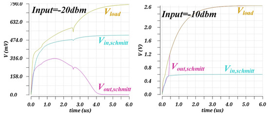 To reduce the system power consumption, M7 is set to be in the subthreshold region even when Vload reaches its highest value. When Vload and Vin,schmitt rise to the point that M7 enters the subthreshold region, the state of M7 is . Due to the current limitation, the voltage across M7 will be maintained at a stable value. Vin,schmitt no longer rises with Vload, but is fixed by the voltage at the terminals of M7, which gives M2 a chance to conduct, and thus, make the output rise. When Vload is higher than a certain value of Vin,schmitt, so that Equation (4) is established, Vout,schmitt jumps, realizing the function of a Vout,schmitt level of 1 under high power. As shown in Figure 7, when the input is −10 dBm, the jump occurs at 0.5 μs, and after 0.5 μs the trigger output is the same as Vload with a level of 1.