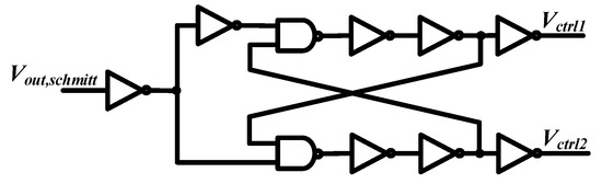 The adaptive control of this system needs to achieve the function that when the system output voltage reaches the switching voltage of the rectifier in parallel and series, there should be a signal that jumps from 0 to 1 to supply the transmission gate to realize the switching of the path. The Schmitt trigger can realize the function of detecting the input voltage and output jumping when the threshold is reached. Figure 6 shows the proposed adaptive structure based on the Schmitt trigger, and a Schmitt trigger structure is shown on the right-hand side. The output of the Schmitt trigger is conditioned to jump from 0 to 1 by M2 conduction, and the jump threshold is determined by the ratio of the sizes of M1 to M5 [30]. In this system, the high-level voltage at the output of the trigger should be the same as the voltage at the output of the system, so Vdd of the Schmitt trigger should be charged by Vload. In this case, the relationship between Vin,schmitt at the output of the Schmitt trigger jump and its decision parameter is as shown in Equation (3).