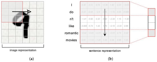 Exemplification of the application of convolutional filters in images and text. (a) A convolutional filter (top left) sliding across a digit from the MNIST dataset []. (b) A convolutional filter sliding across the vectorial representation of a sentence. Here, the filter is sliding in the conventional reading direction.