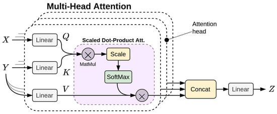 Stacking several self-attention layers produces a multi-head attention (MHA) layer, whose structure is shown in Figure 3. Vaswani et al. [] argue that having multiple attention heads in the layer enables the model to pay attention to different information in distinct feature spaces and at different positions. Input sequences in the attention heads are transformed using linear transformations to generate three different representations, which the authors name (queries), (keys), and (values), following the naming convention used in information retrieval (as in Equation (3)):