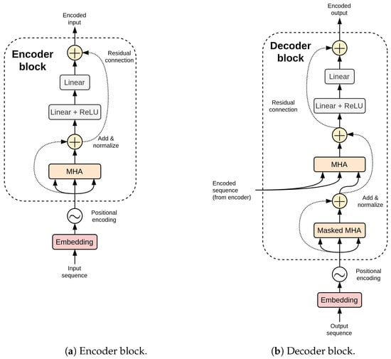 In encoder blocks, , , and are all generated by the input sequence and have the same size; the general structure of an encoder block can be seen in Figure 4a. In decoder blocks, comes from the previous decoder layer, while and come from the output of the associated encoder. These blocks structurally differ from encoders in the presence of another MHA layer, which precedes the standard one and is introduced to mask future tokens in a sentence (Figure 4b). This allows the decoder to be “autoregressive” during training, as it otherwise would trivially look forward in a sentence to obtain the result.