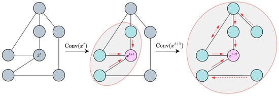 The propagation effect operated by two sequential graph convolutions concerning node x. The red arrows showcase the information flow toward the target node.