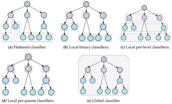 One of the first works to directly address HTC is that of Koller and Sahami []. The authors already highlight some of the most notable characteristics of HTC, such as the inadequacy of flat classifiers as opposed to their hierarchical counterparts (which we describe in Section 3.1) and the proliferation of topic hierarchies. Sun and Lim [] similarly address the difficulties tied to utilizing flat approaches in hierarchical settings, as well as discussing the issues related to standard performance metrics. As we will discuss in Section 3.3, classification metrics such as precision, recall, and accuracy assume independence between categories, which might give a skewed representation of a classifier’s real performance (e.g., performing a misclassification on a child not but not on its parent should be considered better than entirely incorrect classifications). In a subsequent work, Sun et al. [] propose a specification language to describe hierarchical classification methods to facilitate the description and creation of HTC systems.