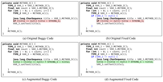 The first group focuses on alterations to the control structures, the second group pertains to modifications in API usage, and the third group involves changes in variable declarations. Each group is designed to aid the models in identifying and assimilating pertinent features from the code, all the while meticulously preserving the original semantics of the code snippets. The ten augmentation operators we utilize adhere to three fundamental principles: (i) they generate variants for both the buggy and fixed code, maintaining semantic consistency while introducing diverse syntactic structures; (ii) for every bug-fix pair, the syntactic alterations applied to the buggy and fixed code are identical to ensure uniformity; and (iii) all applied transformations are correct, preserving the original semantics of the bug-fix pairs without introducing any inaccuracies. As illustrated in Figure 2, the Change If Statement augmentation operator exemplifies this approach by converting a standard if statement in the original bug-fix pair (as depicted in Figure 2a,b) into a conditional expression in the augmented pair (shown in Figure 2c,d). Given that the core semantics of the buggy and corrected code remain intact post-augmentation, the augmented code pairs maintain functional equivalence with their original counterparts, albeit with altered syntactic configurations. By employing ten such operators, we can enrich the bug-fixing dataset with a wide array of syntactically varied yet semantically identical programs. This enhancement allows models to gain a deeper comprehension of different syntactic forms, and to grasp the relationships between syntax and semantics.