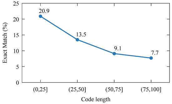 We applied Algorithm 1 to the cutting-edge PLMC, CodeT5 [5], utilizing the Bugs2Fix benchmark dataset [17], which comprises code methods capped at a maximum length of 100 tokens. The entire dataset’s training set served as our input. To achieve a balance between the number of categories and the number of bug-fix pairs within each category, we designated N as 4 and K as 10,000. The outcomes depicted in Figure 3 highlight CodeT5’s performance across various code length categories. These results reflect the relative challenge posed by each group, with superior model performance correlating with lower difficulty levels, and the reverse being true for diminished performance. As illustrated in Figure 3, the model’s performance in program repair declines with increasing code length. This trend underscores the significant influence that code length variability exerts on the model’s ability to program repair, with shorter snippets typically being easier to fix than lengthier ones. This observation aligns with our hypothesis that fixes within longer code fragments are often more intricate, entailing a broader array of context variables, identifiers, and literals that challenge the model’s interpretative capabilities. This phenomenon has also been observed previously by Chen et al. [29]. Consequently, we categorize code pairs with shorter lengths as “easy” samples and those with longer lengths as “hard” samples.