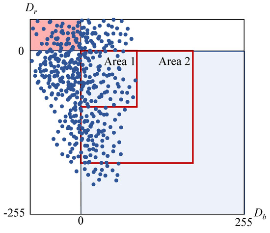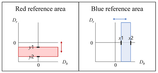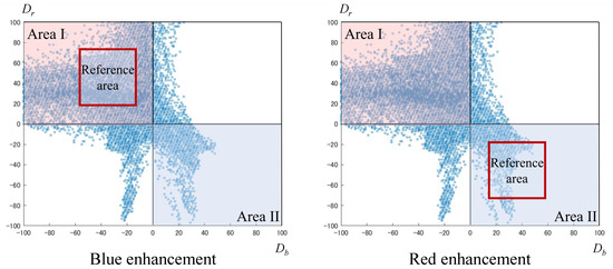 First, the RGB color space is converted to the color space by using Equation (1). We then define the reference areas in the – plane to derive blue and red correction coefficients and , which are represented as the blue reference area and the red reference area. Figure 5 shows an example of each reference area in the – plane. As shown in this figure, each reference area is defined as a rectangle, and the intensity of the enhancement can be controlled by changing the position and size of these rectangles. In the proposed method, the blue reference area is controlled by the parameters and , while the red reference area is controlled by the parameters and . In the case of blue enhancement, the blue reference area is defined in the negative value area of , and the red reference area is defined in the positive value area of . In contrast, in the case of red enhancement, each area is defined opposite to the blue enhancement case. The intensity for the blue tone can be improved by changing the blue reference area to include pixels located further away from the y-axis; the intensity for the red tone can be improved by changing the red reference area to include pixels located further away from the x-axis.