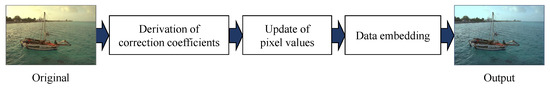We first explain the procedure of our new tone control method in detail. As shown in Figure 4, the process consists of three steps: derivation of the correction coefficients, update pixel values, and data embedding. Each step is described below.