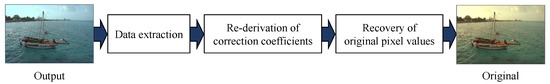 We can perfectly restore the original image from the output image with this method. As shown in Figure 6, the restoration process consists of three steps: data extraction, re-derivation of the correction coefficients, and recovery of the original pixel values.