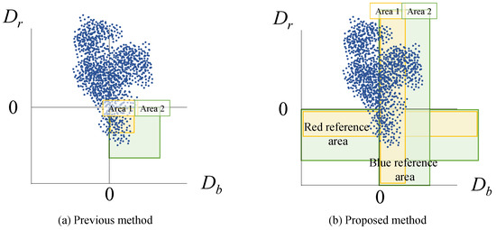 Another advantage is that the proposed method allows for independent control of the correction coefficients for blue and red tones. This leads to an increase in the number of images that can be tone-enhanced. In the previous method, there are cases where effective control of the intensity of enhancement is difficult. Figure 7 shows two examples of reference areas for red enhancement with the previous method [18] and the proposed method. For the image with the pixel distribution shown in Figure 7a, the previous method cannot properly control the intensity of red enhancement. To improve the intensity, it is necessary to increase the mean value of and decrease the mean value of in the reference area. In this example of the previous method, the expansion of the reference area causes both the mean values of and in Area 2 to be smaller than those in Area 1. This effectively enhances the red tone, but prevents proper suppression of the blue tone. In contrast, the proposed method uses two independent reference areas. In Figure 7b, when the blue reference area is enlarged from Area 1 to Area 2, the mean value of in Area 2 never becomes smaller than that in Area 1. As a result, the intensity of the enhancement can be effectively controlled, even in the case of the pixel distribution shown in Figure 7.