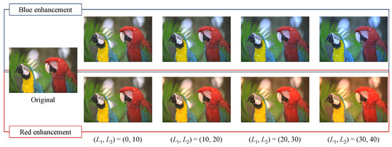 Figure 8 shows the output images of kodim23 obtained by the proposed method. The upper and lower images show the results of the blue and red tone enhancement, respectively. As and were increased while retaining the dimension of the reference areas, the intensity of the enhancement improved. In this example, the intensity of the enhancement was at a maximum for , and the output image was most effectively enhanced compared with the original image.