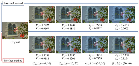 Table 2 shows the mean values of the correction coefficients calculated for each parameter. In this table, and are the correction coefficients for the blue and red tones, respectively. The blue tone was more effectively enhanced as became larger and became smaller, while the red tone was more effectively enhanced as became smaller and became larger. From this table, it is clear that the proposed method could gradually enhance the tones and had a wider range of enhancement. It should be noted that both methods could not derive the output images if there was no pixel in the reference areas. Nonetheless, for certain values of and , the proposed method had a wider reference area than the previous method; thus, the number of images where the tone enhancement was effective with the proposed method was larger than that with the previous method.