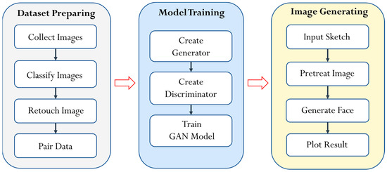 The experimental process, shown in Figure 2, is mainly divided into three steps: dataset preparation, model training, and image generation. In the dataset preparation part, the datasets used for model training are provided, including raw data, ethnicity-enhanced data, and skin color-enhanced data. In the model training step, the prepared datasets are used to train the GAN model, and then the trained generation model is provided for the subsequent image generation.