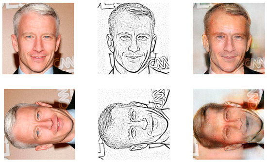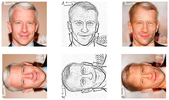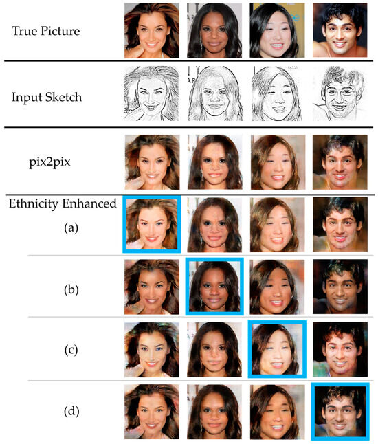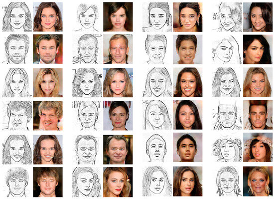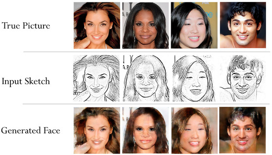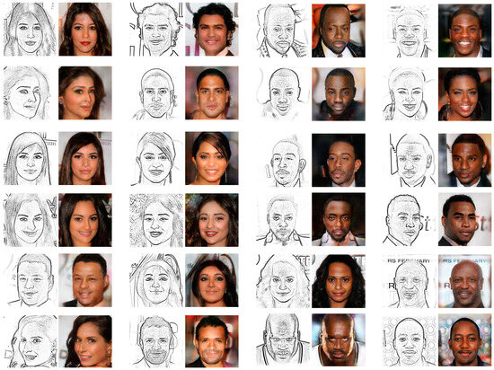 In this work, the goal is to transform images from sketches into realistic portrait images. The datasets used to train the generative model include the real portrait photos and the corresponding sketch images. The CelebA-HQ dataset, containing about 30,000 images of 1024 × 1024, is a collection of portraits of American celebrities [47,48,49,50]. In this study, the CelebA-HQ dataset was used as the image source of the self-built dataset to create sketch images. As trained by the traditional GAN scheme, the outcomes are shown in Figure 3. At this stage, only Caucasian images can be generated, no matter what the original skin color is. If the training set is composed entirely of images with a single skin color, it is expected that the generative model, when trained on such data, may have limitations in generating realistic images with diverse skin tones. The model learns from the patterns present in the training data, and if the data is not diverse enough, it might not generalize well to other skin tones. In this case, we added multiple-skin-tone images to the training dataset, but the output did not change as desired under the traditional GAN framework.