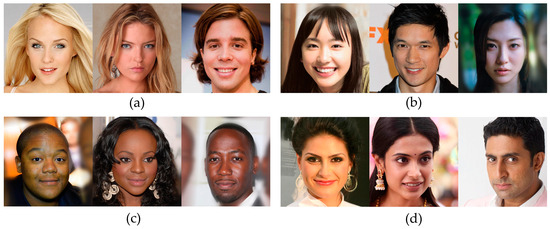 Based on the CelebA-HQ Dataset, a new dataset was constructed based on classifications of ethnicity, namely Caucasian, African American, Asian, and Middle Eastern. There are 200 images of each category, and the samples from the dataset are shown in Figure 4. The architecture of the training model was re-planned, three independent generative models were added, and four generative models were used to generate images associated with different ethnicities for each of the four people.