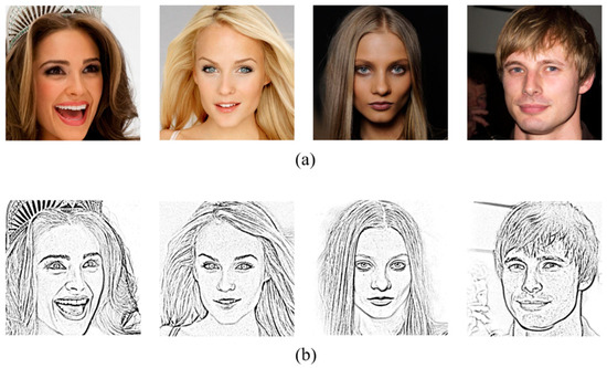 The CelebA-HQ dataset is considered a collection of original images, and the associated sketches can be obtained using Adobe Photoshop, as shown in Figure 6. The workflow to generate sketches from Photoshop includes serval steps. After opening the image, the process to be followed is to duplicate the background layer to preserve the original image and then convert the duplicated layer to grayscale. To preserve the characteristics of the sketches, Gaussian blur is applied to smooth the details of images. The negative image is created by utilizing the function of inverting color. Finally, a sketch-like effect can be generated by setting the blending mode of the duplicate layer. There is a set of paired images, in which each sketch image is associated with its corresponding original image. The pairs are used for image-to-image translation, in which the goal is to transform an image from a sketch into a second realistic image. In the image-to-image generative model, the paired images will be used as markers in training. The sketch image is the input of the generated model during training, and the original image is the expected output of the generated model.