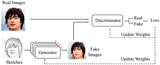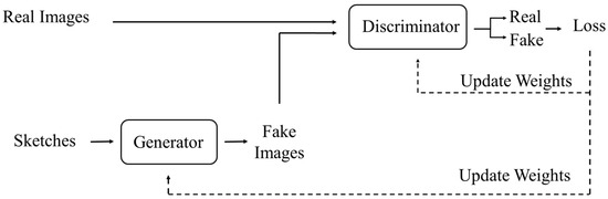 The training process of the traditional Generative Adversarial Network is depicted in Figure 11. A sketch from its paired image is fed into the generator for image generation, and the generated image is called a fake image. Both the fake and real images will be fed into the discriminator for distinction. The discrimination results will be fed back, not only to the generator, but also to the discriminator itself. The generator is updated based on the feedback from the discriminator when the generated fake image is judged as fake. By iteratively updating the parameters of the generator and discriminator based on the feedback from each other, the GAN learns to generate increasingly realistic images.