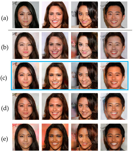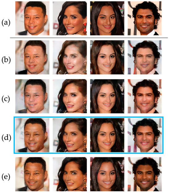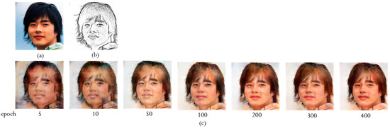 In the context of deep learning training, an epoch refers to one complete pass through the entire training dataset. The number of epochs represents how many times the learning algorithm will work through the entire training dataset. In general, too few epochs may result in underfitting, and too many epochs may lead to overfitting. In this work, the testing results regarding different numbers of epochs are shown in Figure 13. During the training process, the images in the image samples are randomly selected for testing. Significant improvements in facial features can be observed in the generated images from epoch 5 to epoch 50. Moreover, the improvement from epoch 100 to 200 is much more subtle. In this paper, the number of epochs selected for the model training is 200.