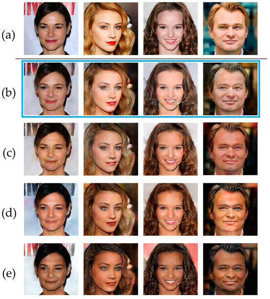 Image generation with skin color-enhanced GAN: (a) real image (pale white), (b) pale white, (c) light brown, (d) dark brown, and (e) deep dark brown.