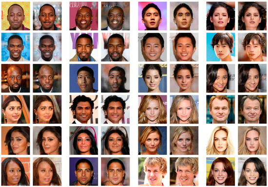 The quality of the generation of color skin images has been improved with the ethnicity-enhanced or skin color-enhanced GAN model. However, there exists a problem in the background generation. In Figure 21, there are two images in a group; the left image is the real image, and the right image is the generated image. Even though the proposed enhanced models successfully generate face images, there are challenges with generating corresponding backgrounds. The differences in style and color among the backgrounds is too large, making it difficult to fully learn the relationship during training. Addressing this challenge requires handling diverse background styles and colors. We have considered this problem when building the training dataset. We have also tried to choose candidate images with less difference in their backgrounds. In practice, nearly 27,000 images out of the 30,000 images available in the CelebA-HQ dataset were selected for the current training set. If the criterion of background selection is further raised, the number of image samples in the dataset may be insufficient.