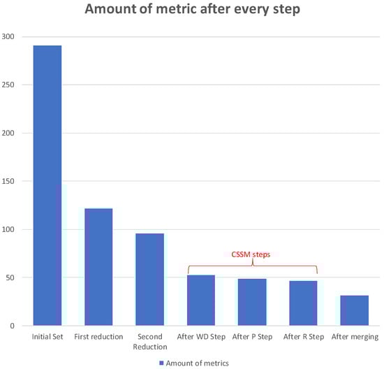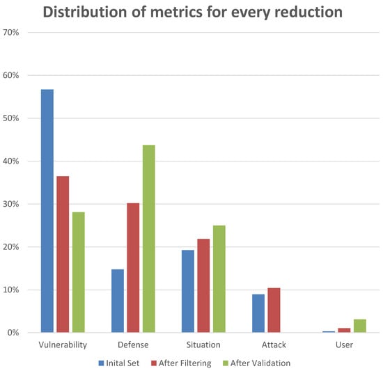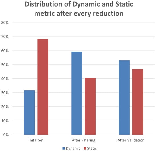 A final representation of our results is shown in Figure 4: in the initial set, the partitioning between static and dynamic metrics was not balanced; however, as we performed each step of the filtering and validation process, the difference in quantities between static and dynamic security metrics improved, reaching an almost balanced partitioning.