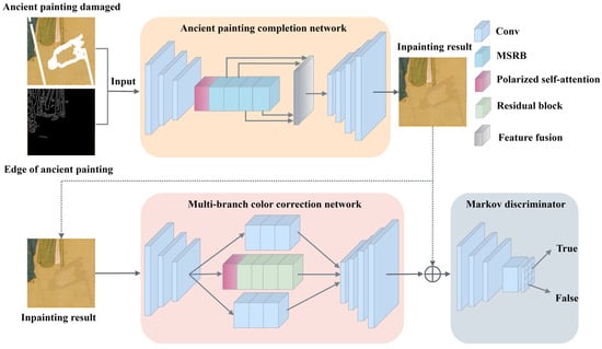 In recent years, deep convolutional neural networks have made significant progress in natural image inpainting [4,5,6,7,8,9,10,11]. Pathak et al. [4] first used a generative adversarial network (GAN) with a contextual encoder to restore images from learned image features. Then, Liu et al. [5] and Yu et al. [6] proposed partial convolution and gated convolution respectively. These convolutions use pixel diffusion to achieve progressive inpainting, which solves the problem of the limited receptive field range of ordinary convolution. Yu et al. [7] designed a multi-stage image inpainting network to overcome the limitations of single-stage networks in terms of inpainting capability. In addition, the inpainting process of the network is divided into two stages: coarse inpainting and fine inpainting, which simplifies the training process at each stage and thus improves the inpainting efficiency. Based on this idea, a series of multi-stage inpainting networks were proposed in [8,9,10] to restore images progressively from small to large scales using a pyramid structure. These networks are composed of multiple sets of GAN at different scales. Li et al. [11] designed a recurrent feature reasoning network, where a feature reasoning module can iteratively derive the mask boundary feature map and use it as a clue for further inference. In addition, the author also designed knowledge consistency attention to adaptively fuse attention scores and gradually refine the feature map. Although current deep learning-based methods can restore natural images well, there are still challenges in terms of inpainting ancient paintings with varied features and dense textures. These challenges include insufficient feature extraction and loss of detail. Cao et al. [12] proposed a method that uses a fully convolutional network (FCN) to extract deep image features. They also used global and local discriminators to assess the authenticity of the restored mural images. Wan [13] designed a two-stage model for restoring cultural relic images. In the first stage, a coarse restoration model is used, which constructs an encoder and decoder using gated convolution. A fine restoration model is applied in the second stage, which uses a semantic attention mechanism to guide the restoration process based on semantic information. Zhang et al. [14] proposed a painting inpainting method by embedding multiple attention dilation convolutions to obtain dense multi-scale context information. Zhang [15] designed an ancient painting model that uses an edge inpainting network to guide the generation of missing texture areas. Although the above methods can restore information from ancient paintings, blurring and lack of semantics may arise when filling in large, damaged areas. Moreover, these art and painting inpainting methods struggle with precise color control, which can result in color bias in the output. Ultimately, the goal is to restore ancient paintings to their original state as accurately as possible. However, relying solely on damaged paintings as a reference for the network may result in restored paintings that look visually acceptable but do not truly reflect the original appearance.