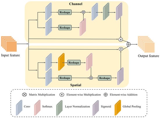 The attention mechanism is a crucial technique that finds extensive use in deep learning-based methods. It allocates distinct weights to various features, allowing the model to automatically identify and concentrate on the most relevant information. This results in an improved ability of the model to process essential information. There are three main types of attention mechanisms: the spatial attention mechanism [40], channel attention mechanism [41,42], and channel–spatial hybrid attention mechanism [43,44,45]. The spatial attention mechanism evaluates the importance of spatial location information. It enhances useful features and reduces useless ones. The channel attention mechanism models the relationship between channels. It ensures that important channels receive more attention. The channel–spatial hybrid attention mechanism combines the spatial and channel attention mechanisms. It can be used in parallel or series to capture critical features.