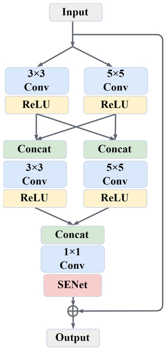 The MSRB introduces the attention mechanism network (SENet) [47] after feature fusion. SENet consists of two parts, squeeze and excitation. The core idea is to adaptively weight the channels of the feature map after convolution, obtaining the weights of each channel, so that the network pays more attention to the most useful channel features.