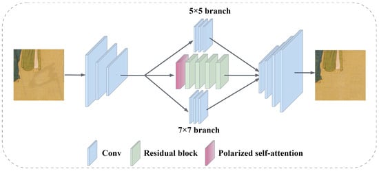 The U-Net [37] with skip connections [38] is employed in the ancient painting completion network and multi-branch color correction network to achieve multi-scale feature fusion. The ancient painting completion network also uses a multi-scale residual block (MSRB) between the encoder and decoder. MSRB combines dilated convolution [39] and channel attention mechanisms in order to expand the perceptual field and extract vital features. Additionally, the polarized self-attention (PSA) mechanism can focus on key areas of ancient paintings, which preserves the essential details during encoding. As a result, the network generates high-quality ancient paintings with consistent content and complete semantics during decoding.