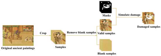 A dataset containing 12,509 images of Chinese ancient paintings has been established for the purpose of the inpainting of ancient paintings. These images are obtained by cropping four famous paintings from different times and styles. One of these paintings, Along the River During the Qingming Festival, is a copy of an original work, painted by Zhang Zeduan during the Song Dynasty, which was painted by the Ming Dynasty painter Qiu Ying. The construction process of the dataset is detailed in Figure 5. Initially, original ancient paintings were cropped with a size of 256 × 256 using Photoshop. Blank samples were excluded to ensure the diversity and quality of the dataset. Subsequently, the dataset was divided into a training set, validation set, and test set, with quantities of 10,500, 1373, and 624 respectively, as shown in Table 2. To accommodate different damage rates, a mask dataset publicly available in [5] was adopted, which provides mask images with damage rates ranging from 1% to 60%.